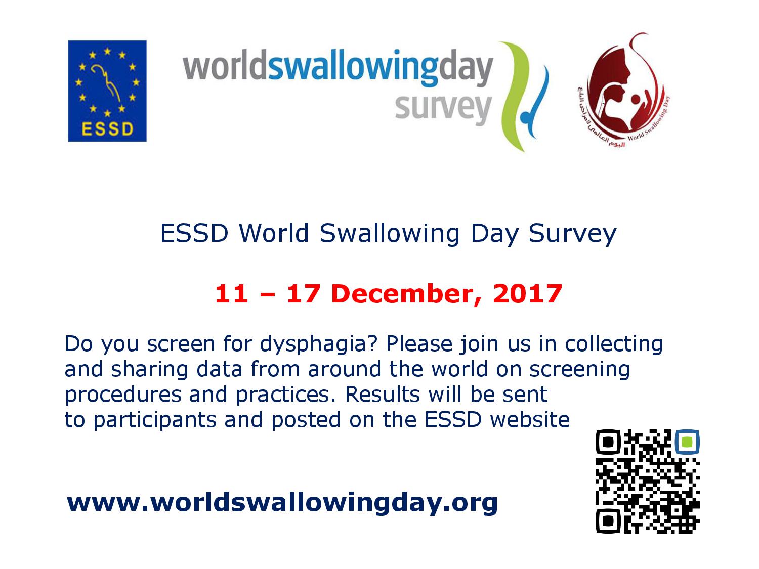 každý rok provádí ESSD průzkum diagnostiky orofaryngální dysfagie v rámci Světového dne polykání. Pokud screenujete nebo diagnostikujete pacienty s dysfagií, připojte se k projektu a vyplňte dotazník s podrobnostmi o pacientech, které jste screenovali nebo diagnostikovali během týdne od 11. do 15. prosince 2017.