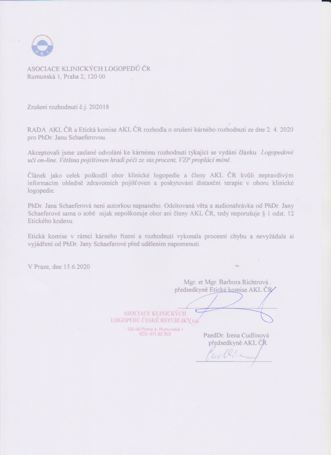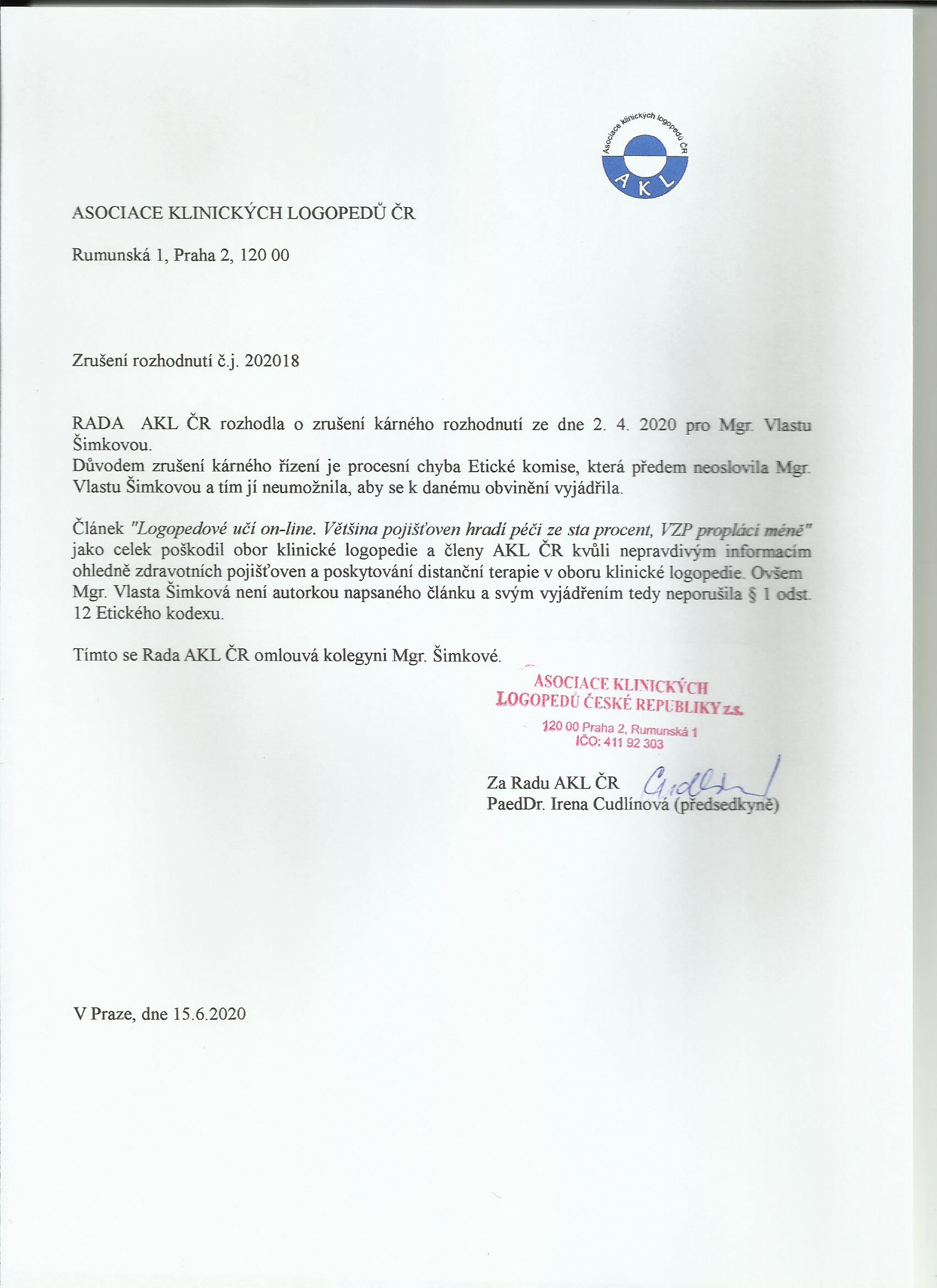 Bylo zrušeno kárné řízení a Rada se omlouvá kolegyni Mgr. Šimkové Vlastě a PhDr. Schaeferové Janě