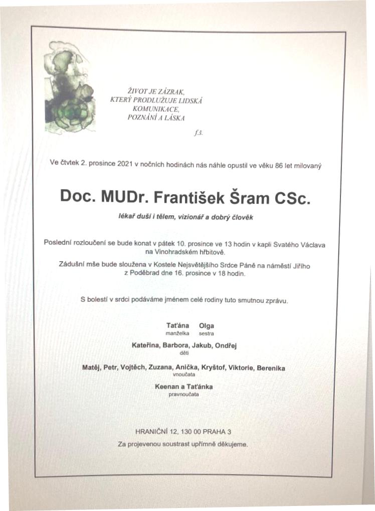 ve čtvrtek 2. prosince nás náhle opustil, ve věku 86 let, doc. MUDr. František Šram, CSc.