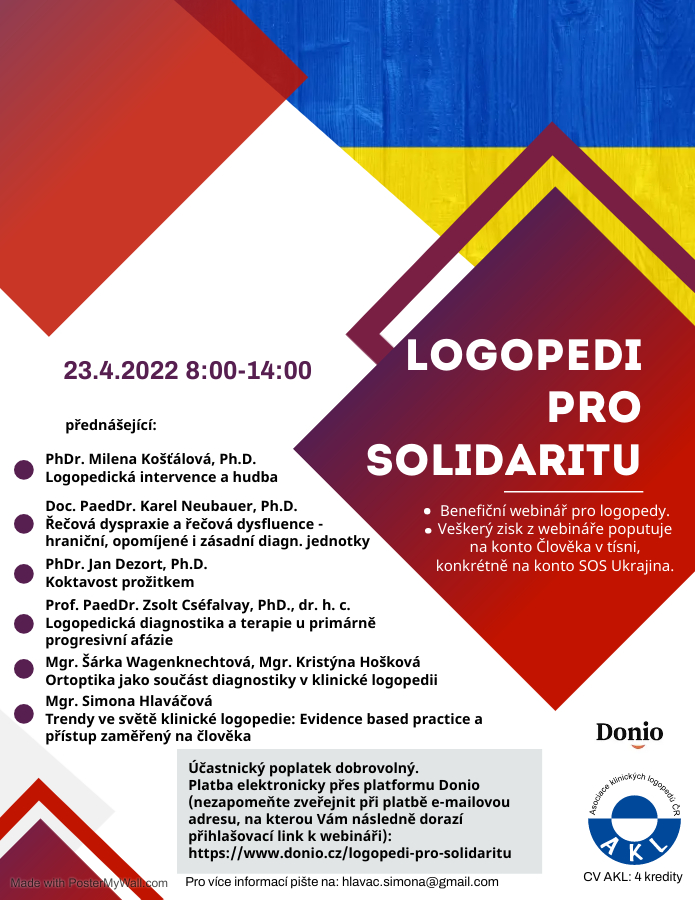 „Logopedi pro solidaritu“ je benefiční odborný webinář pro logopedy pořádaný 23. 4. 2022 v čase 8:00–14:00, jehož cílem je nejen nabídnout velmi zajímavé přednášky na aktuální témata, ale současně finančně pomoci nejpotřebnějším.