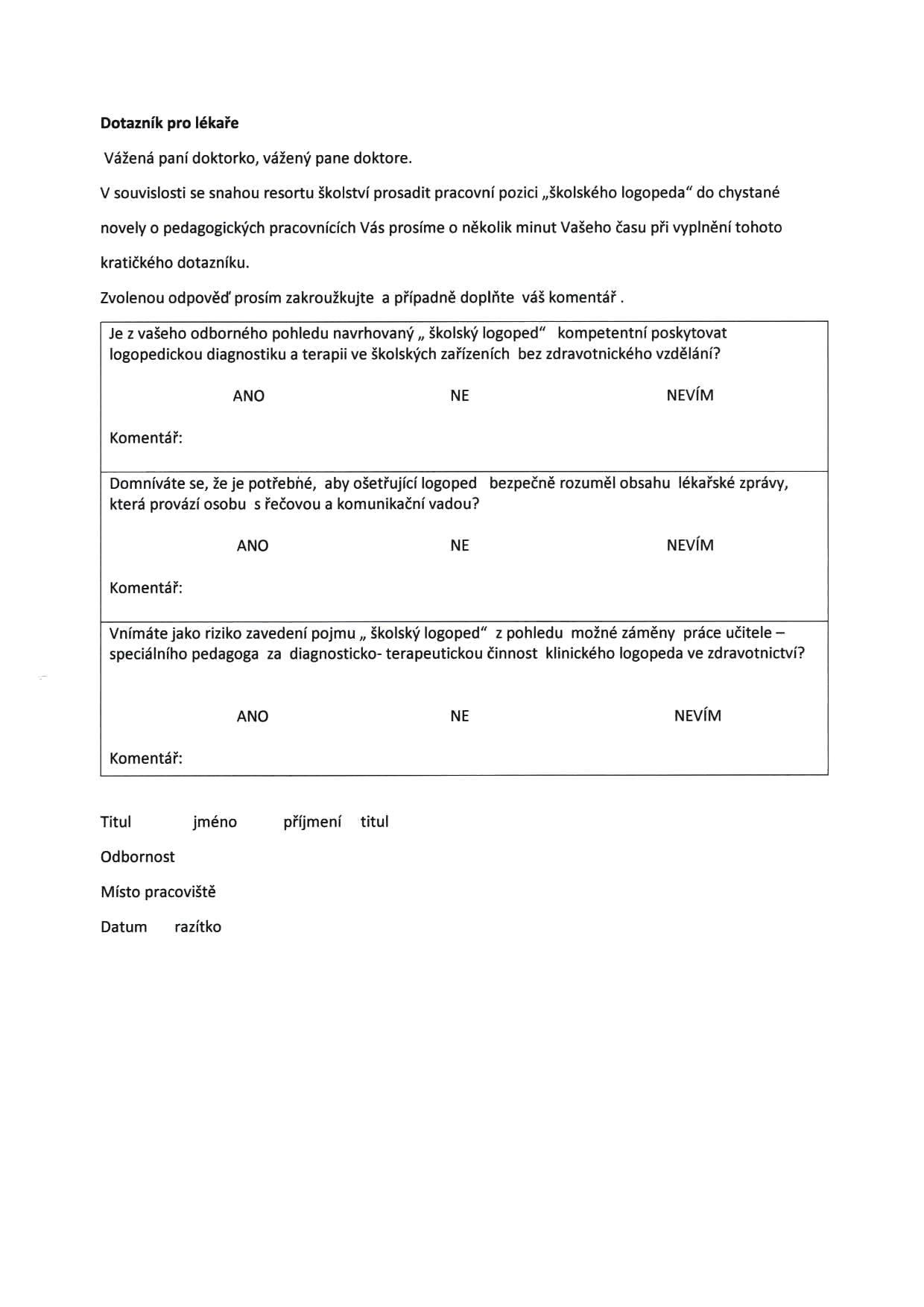 Návrh " školského logopeda " s navrhovanými kompetencemi považujeme za prolamování kompetencí školství do zdravotnictví.
