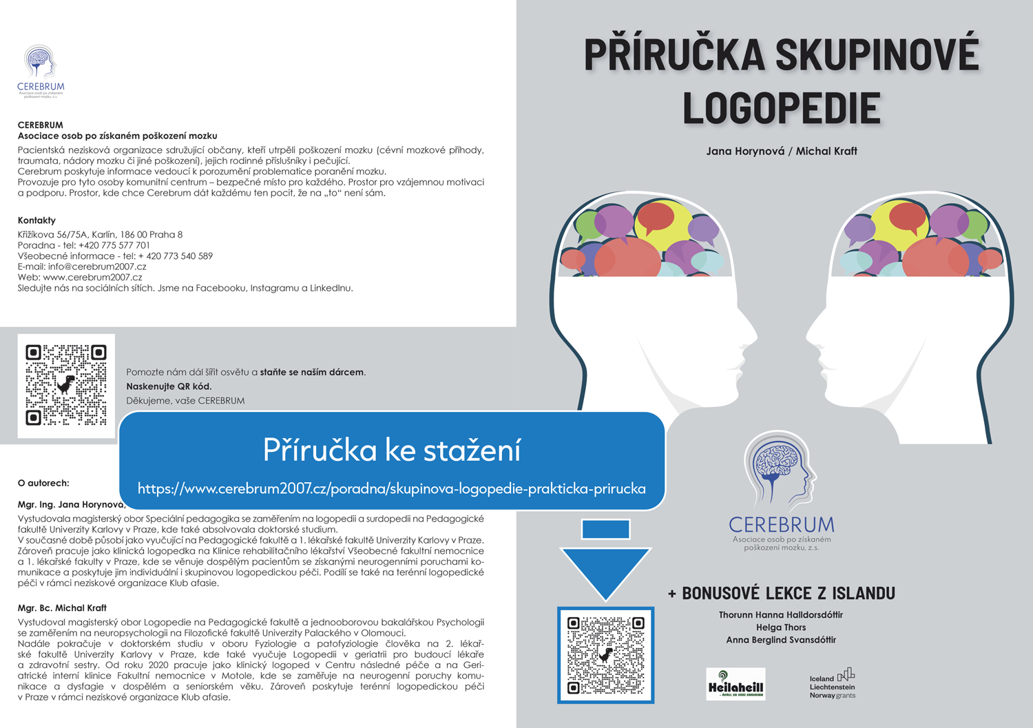 Praktická příručka skupinové logopedie byla vydána pacientskou organizací Cerebrum pro osoby se získaným poškozením mozku ve spolupráci s klinickými logopedy z ČR (Jana Horynová/Michal Kraft) a z Islandu. Recenzi napsala Lenka Dzidová.