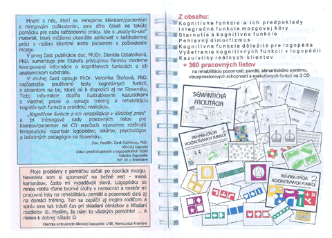 Z obsahu: Kognitivní funkce a jejich předpoklady. Integrační funkce mozkové kůry. Stárnutí a kognitivní funkce. Pohlavní dimorfismus. Kognitivní funkce důležité pro logopeda. Vyšetření kognitivních funkcí v logopedii. Kazuistiky reálných pacientů. Navíc 360 pracovních listů na rehabilitaci pozornosti, paměti, sémantického systému, vizuoprostorových schopností a exekutivních funkcí na 3 CD.